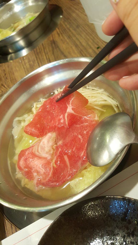 肉片是絕對有厚度的,如此才吃的到口感,要不然像一般涮涮鍋店那種厚度,無論給你豬雞牛羊,吃起來其實都一個樣!於是我將肉片燙到粉紅色起鍋,灑上一點玫瑰鹽,緩緩放入口中,咀嚼。同事們看著我,著急的想知道這看著很漂亮的肉片口感如何。甫放入口中,便已有牛肉淡淡的香氣,開始咀嚼之後,分佈在肉片上的油花散了開來,整口充滿了甜甜的味道,而且還很滑嫩!我忍不住脫口而出:「哇,這肉也太香了吧!」